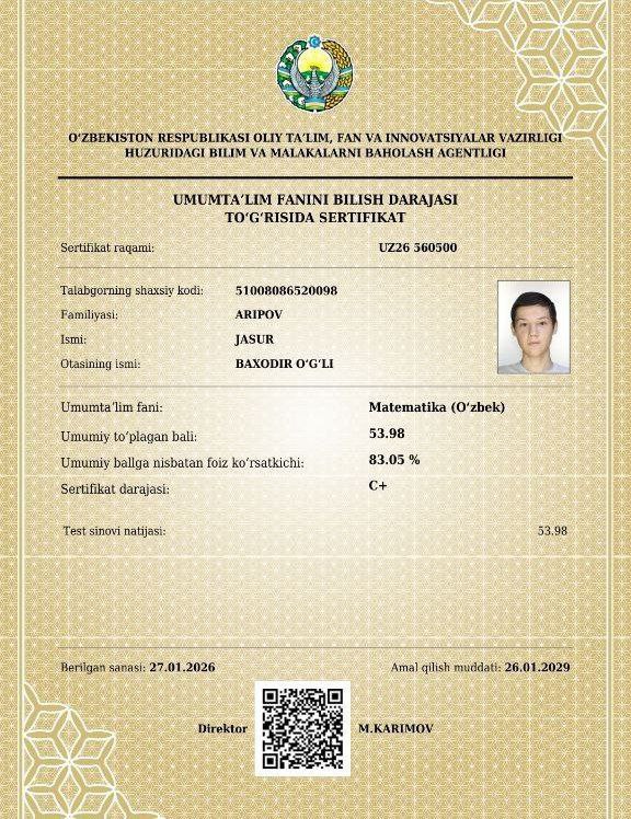 11-sinf o‘quvchisi Jasur Aripov matematika fanidan Milliy sertifikatni qo‘lga kiritdi