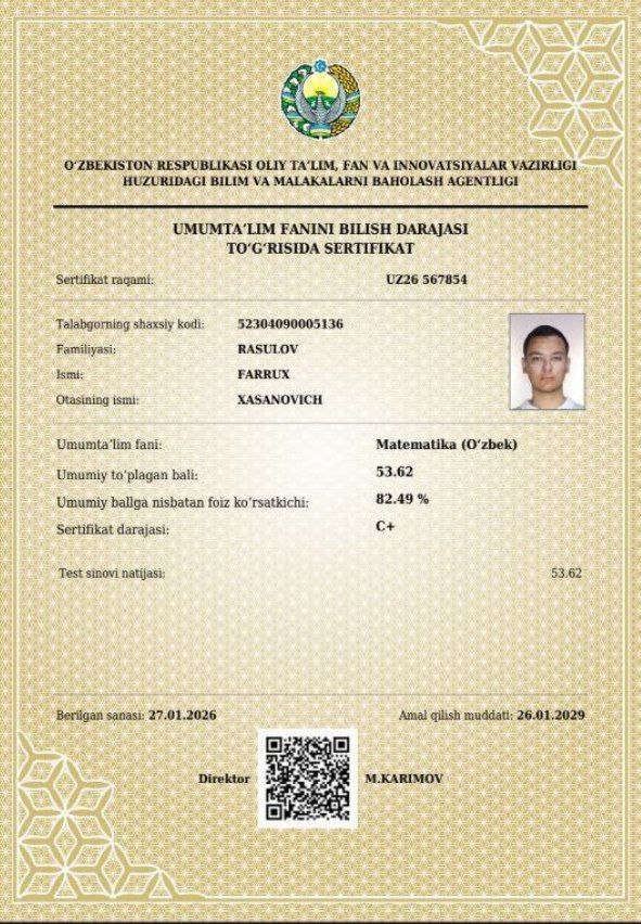 11-sinf o‘quvchisi Farrux Rasulov matematika fanidan Milliy sertifikatni qo‘lga kiritdi